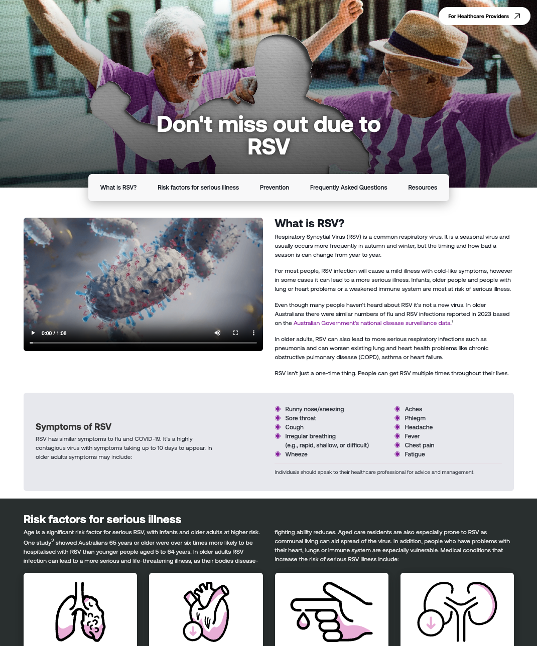 Australia served as the first market pilot. I partnered with the country marketing lead to build a RSV disease education site using the new template, documenting market-specific needs and edge cases. The objective was to validate fit-for-purpose, surface gaps, and capture improvement before a broader rollout.